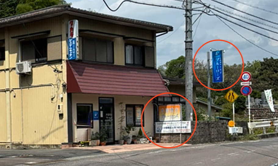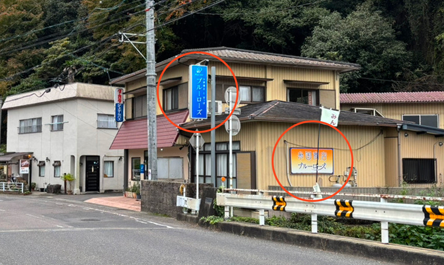 東から見た画像です。建物外壁に「ブルーローズ」と記載されたオレンジ色の看板が設置されています。