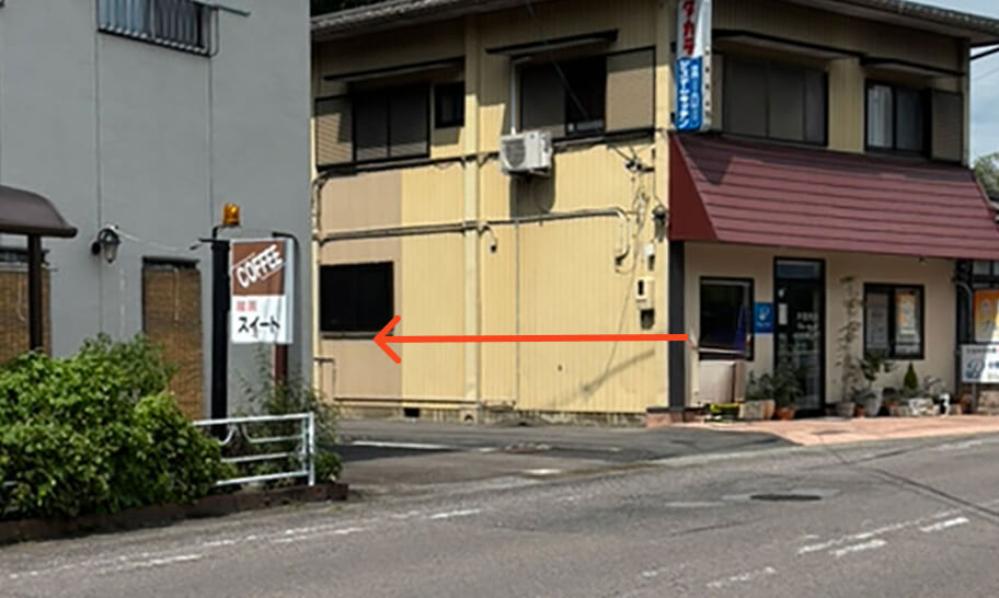 西から見た画像です。フェアリー長谷川ジムへは「ブルーローズ」という青い看板(オレンジ色の看板)を目印にしてください。